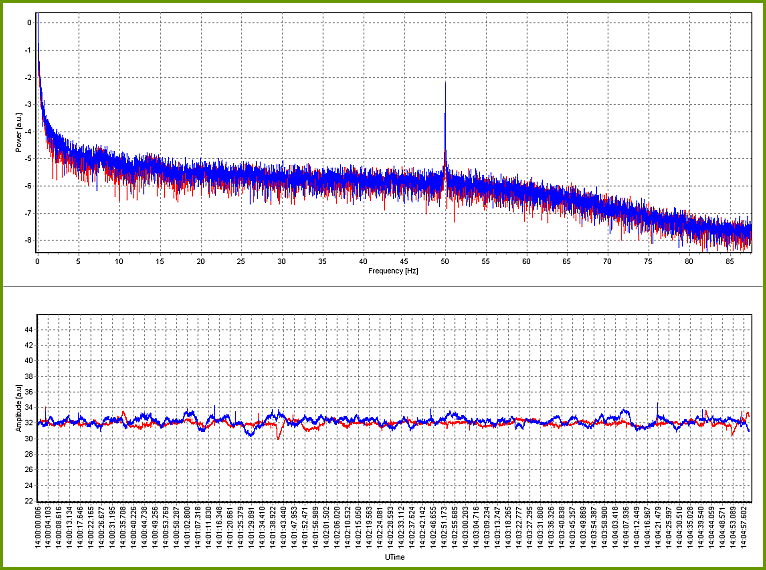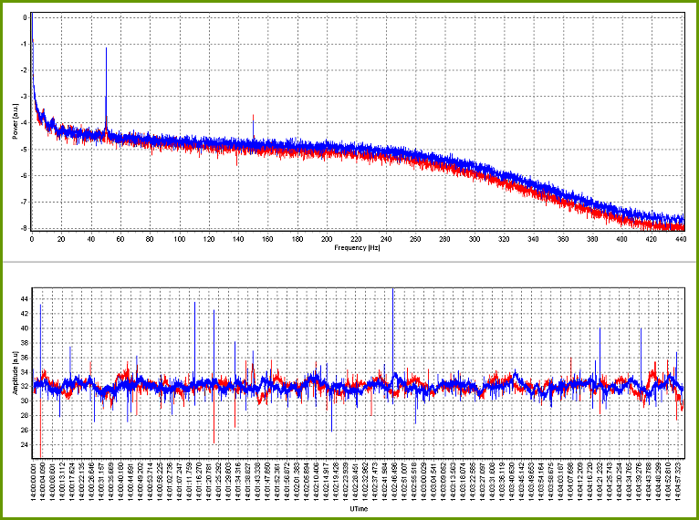 Examples of raw ELF dataHere you can download an example of ASCII file containing 5 minutes of our ELF raw data. The second and the third columns contain the signal collected by our magnetic antennas NS and EW, respectively. The data come from 60Hz bandwidth receiver Ela7 and they were recorded on 10.07.2014 14:00 UT by Hylaty station. The following graph shows the ELF data (16-bit converter units) in the frequency and time domain. |