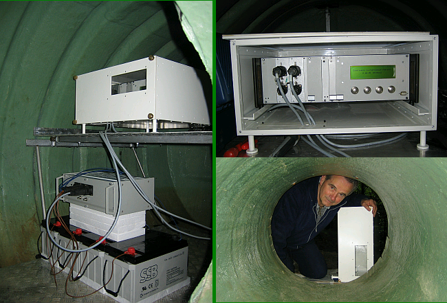 The station is placed on a gentle slope of a hill at the geographic location 49.2°N, 22.5°E. The container, placed at a shallow depth underground, has a cylindrical shape and is made of epoxy laminate. It has a diameter of 2 meters and a length of 3 meters. The container is covered with about 1 meter thick ground layer. Such a design keeps the temperature inside the container above 0°C (degrees Celsius) without necessity of heating during the whole year - the lowest temperature measured during the last 7 years was 2°C. Currently the station is equipped with two ELF receivers, each has a GPS synchronized clock and a power supply that enable 2 months of continues operation without recharging. |